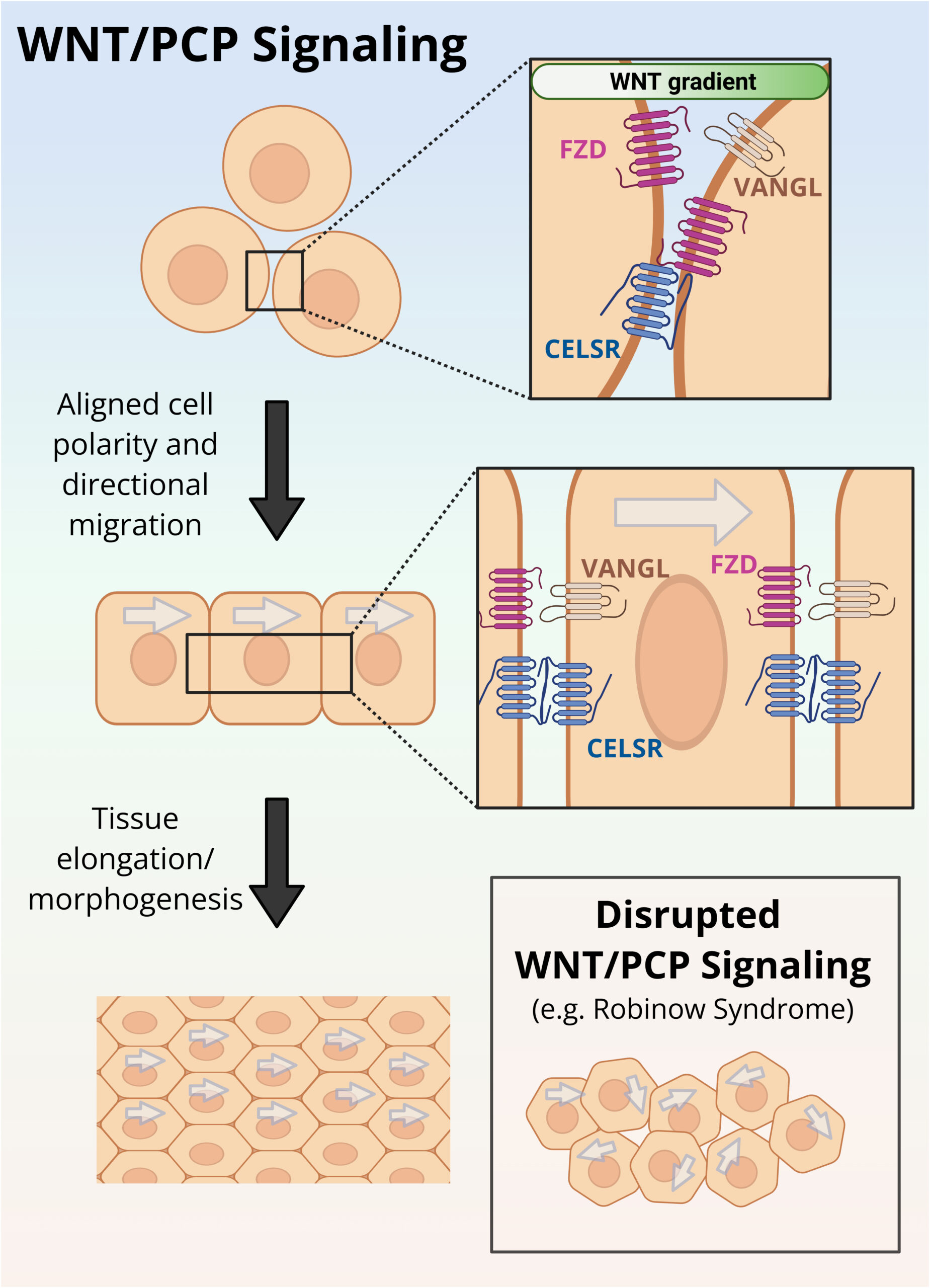 Noncanonical Wnt signaling pathways, including planar cell polarity (PCP) signaling, are essential for tissue organization, morphogenesis and coordinated cell behaviors such as directional migration and oriented cell division. Disruption of these pathways leads to profound developmental defects and underlies human disorders, including Robinow syndrome.